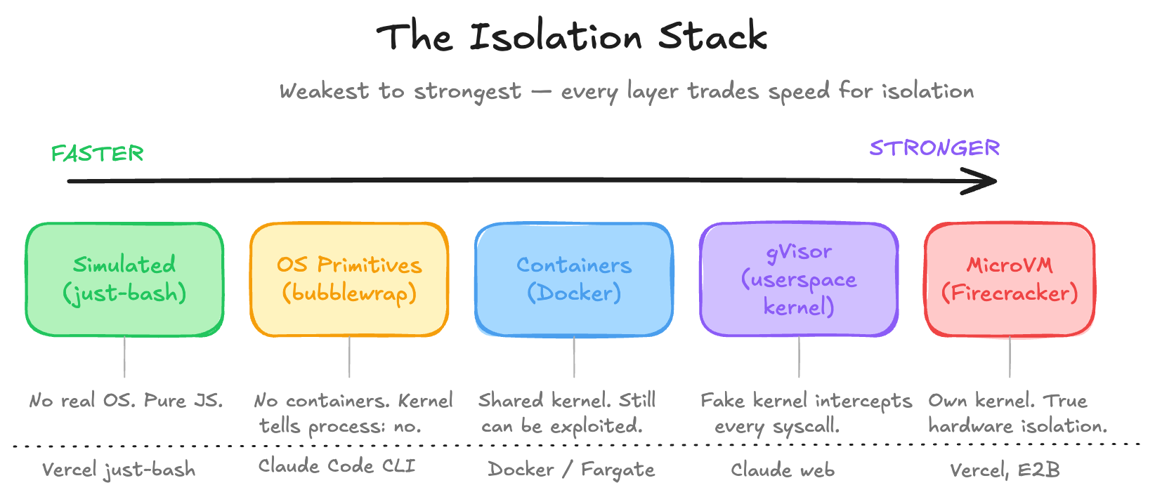 Last but not least, OS-level primitives like Bubblewrap or Seatbelt. These take a different approach. No containers, no VMs. Just the kernel telling a process what it can touch and what it cannot. Bubblewrap on Linux, Seatbelt on macOS. These restrict file system access, network, and syscalls at the process level. Super fast, zero overhead, no Docker required. This is what Anthropic uses for Claude Code CLI. It makes sense. You’re not going to ask someone to install Docker just to use a CLI tool.