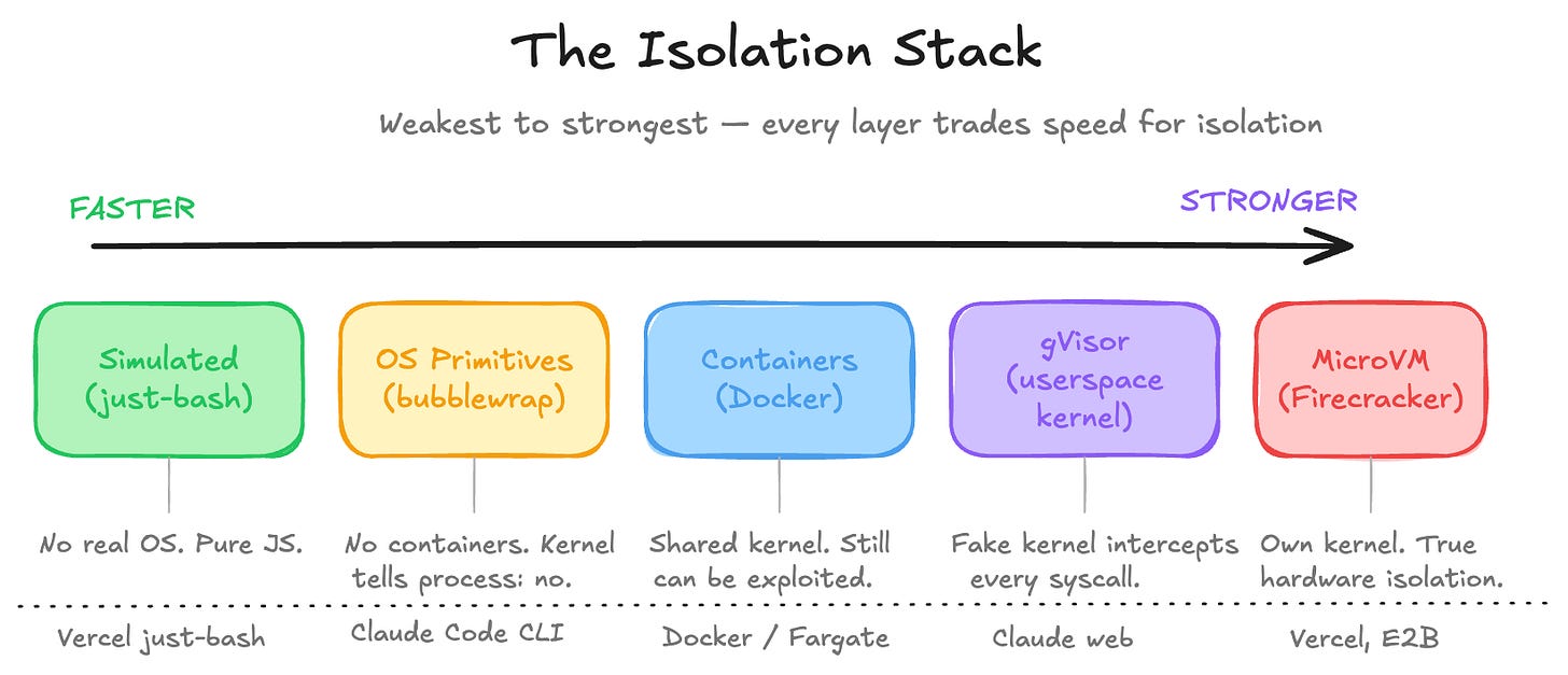 Simulated environments don’t use an operating system at all. For example, Vercel built just-bash, which is a TypeScript implementation of Bash with an in-memory file system. The agent thinks it’s running shell commands, but it’s just JavaScript. Zero syscall surface. Starts instantly. Works in the browser. This only makes sense for agents that manipulate files and run simple logic, but we should always default to the principle of least privilege and ask for more when actually needed.
