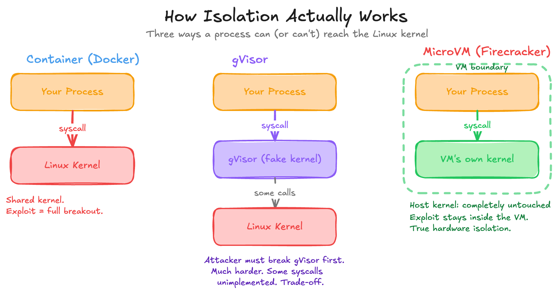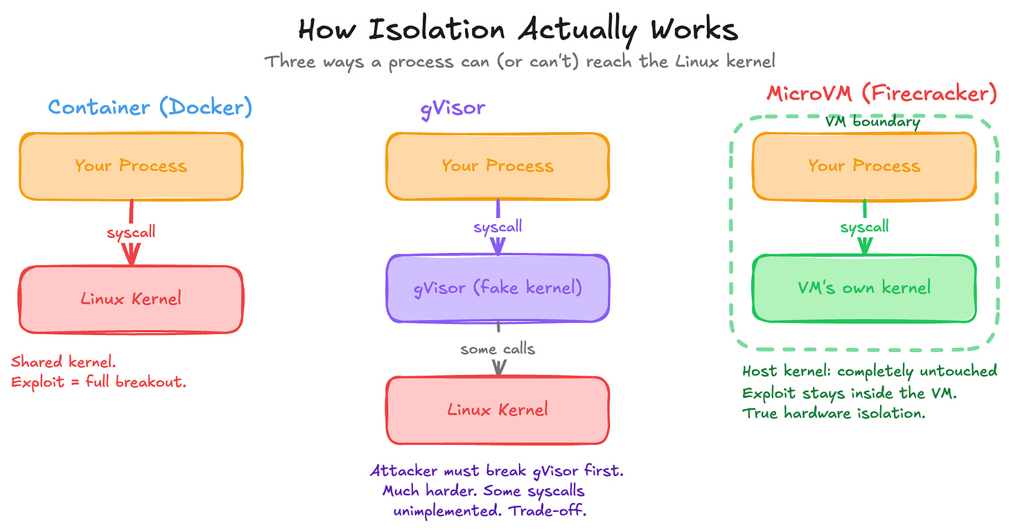 Kernel exploits now become much harder because an attacker has to exploit gVisor, not Linux. The trade-off is that it’s slower, and not every syscall is implemented, because that would mean re-implementing the entire kernel, so some software can break. But this is what Anthropic uses for Claude web. So clearly it can be used in production with no problem at all.